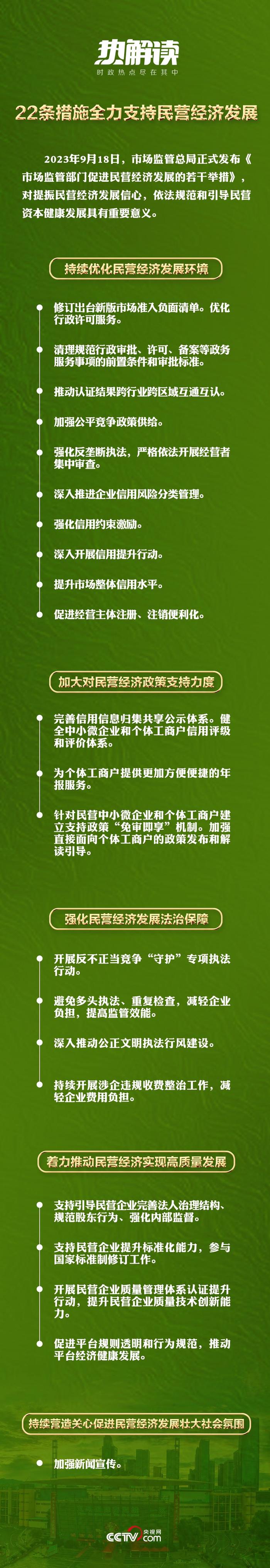 2023年7月14日,中共中央國務院出台《關於促進民營經濟發展壯大的意見》,對促進民營經濟發展壯大作出新的重大部署。2023年9月18日,市場監管總局發佈《市場監管部門促進民營經濟發展的若干舉措》,通過22條措施為全力支持民營經濟發展設計了具體落實的“施工圖”。