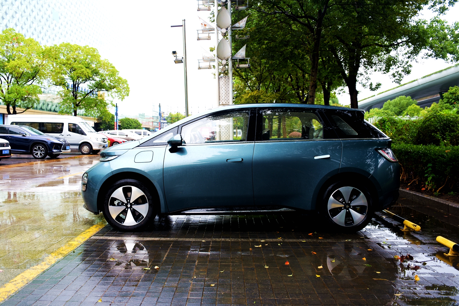 車身側面採用了獨到的無稜線設計,曲面呈流線型,型體圓潤飽滿。前側的多功能後視鏡集轉向燈、電加熱、電動調節、電動摺疊等功能為一體;此外兼具盲區提醒、360攝像頭、隱藏式感應門把手,自動無骨雨刮等配置。下方配有215/55 R18的低風阻五幅式鋁輪。