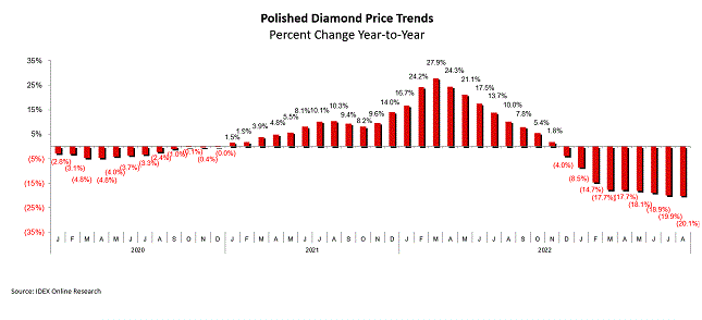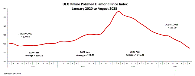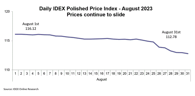 8月份的鑽石價格再一次下跌。據國際鑽石交易平台IDEX數據,IDEX價格指數單月下降2.87%,跌幅超過7月的2.57%,並達到了2008年1月以來的最低點。自2022年3月開始,價格指數便一直處於下跌的趨勢。