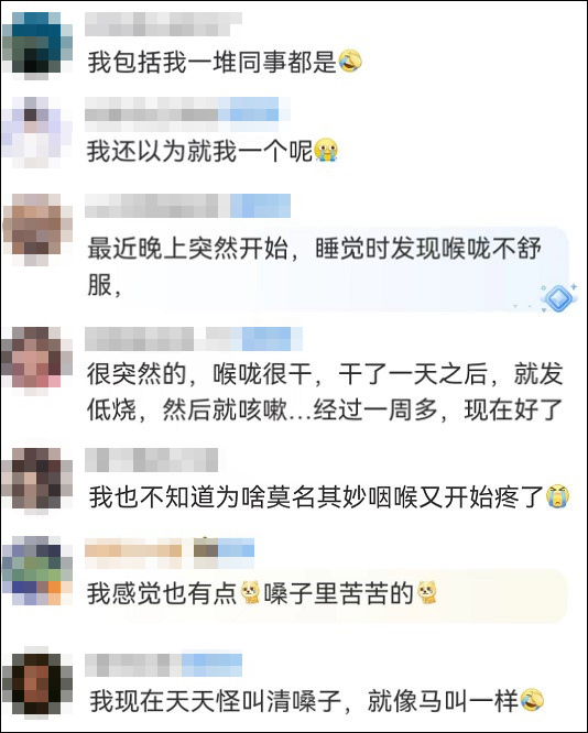網友們紛紛留言:“嗓子裏苦苦的”“喉嚨很乾”“我還以為就我一個呢”。