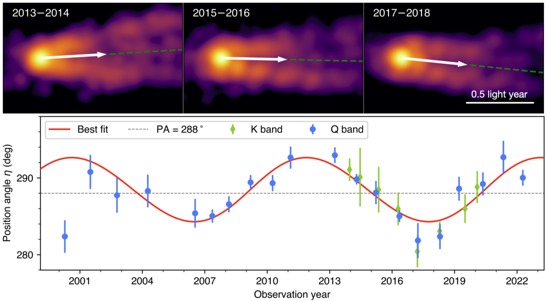 圖2. 2013年至2018年期間每兩年合併後的M87噴流結構(觀測頻段為43 GHz)。對應的年份顯示在左上角。白色箭頭指示了每個子圖中的噴流位置角度。下圖:基於2000年至2022年以一年為單位合併的圖像得出的最佳擬合結果。綠色點和藍色點分別來自22 GHz和43 GHz的觀測頻段的數據。紅線表示根據進動模型的最佳擬合結果。(來源:Yuzhu Cui et al. 2023)