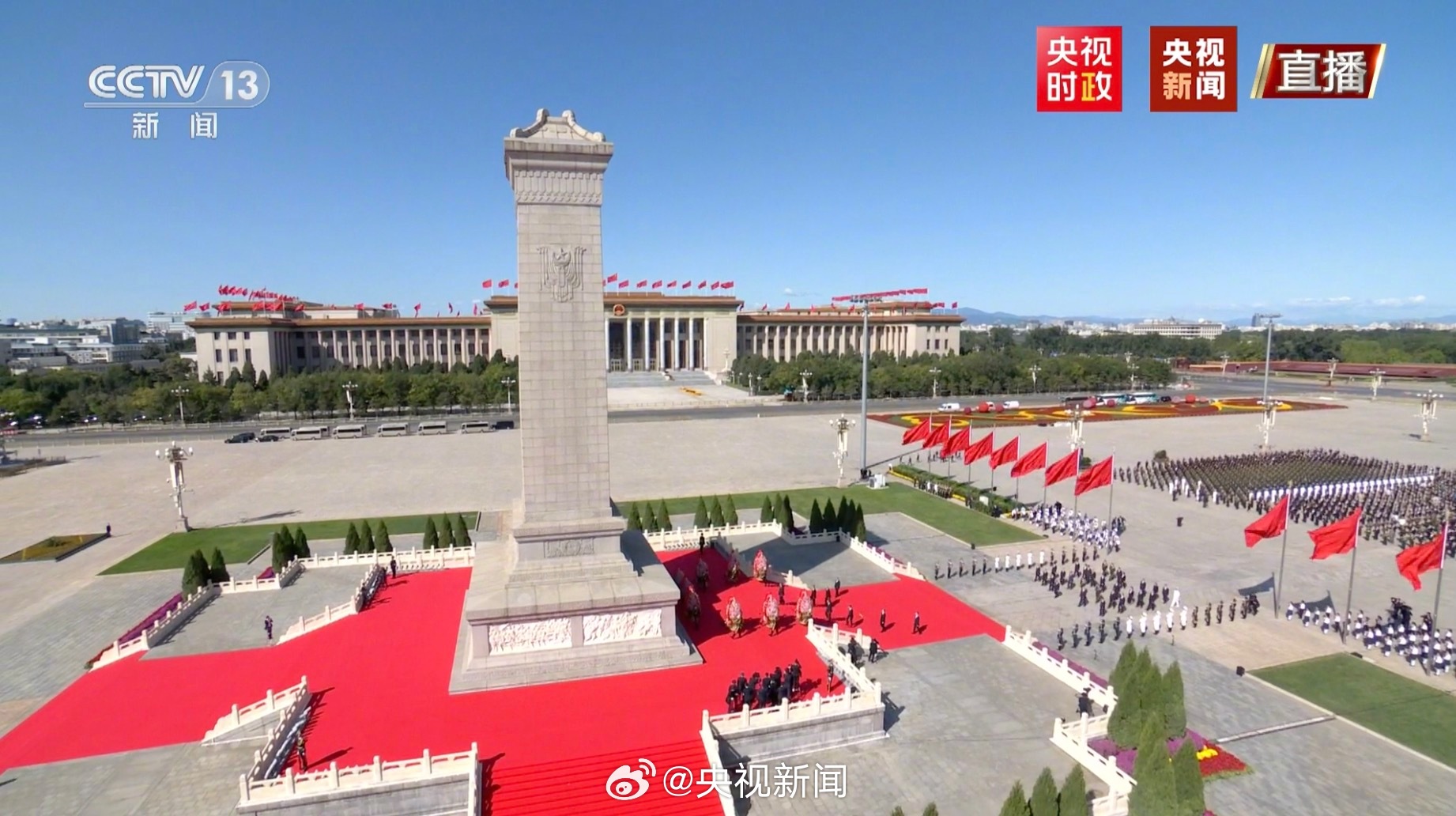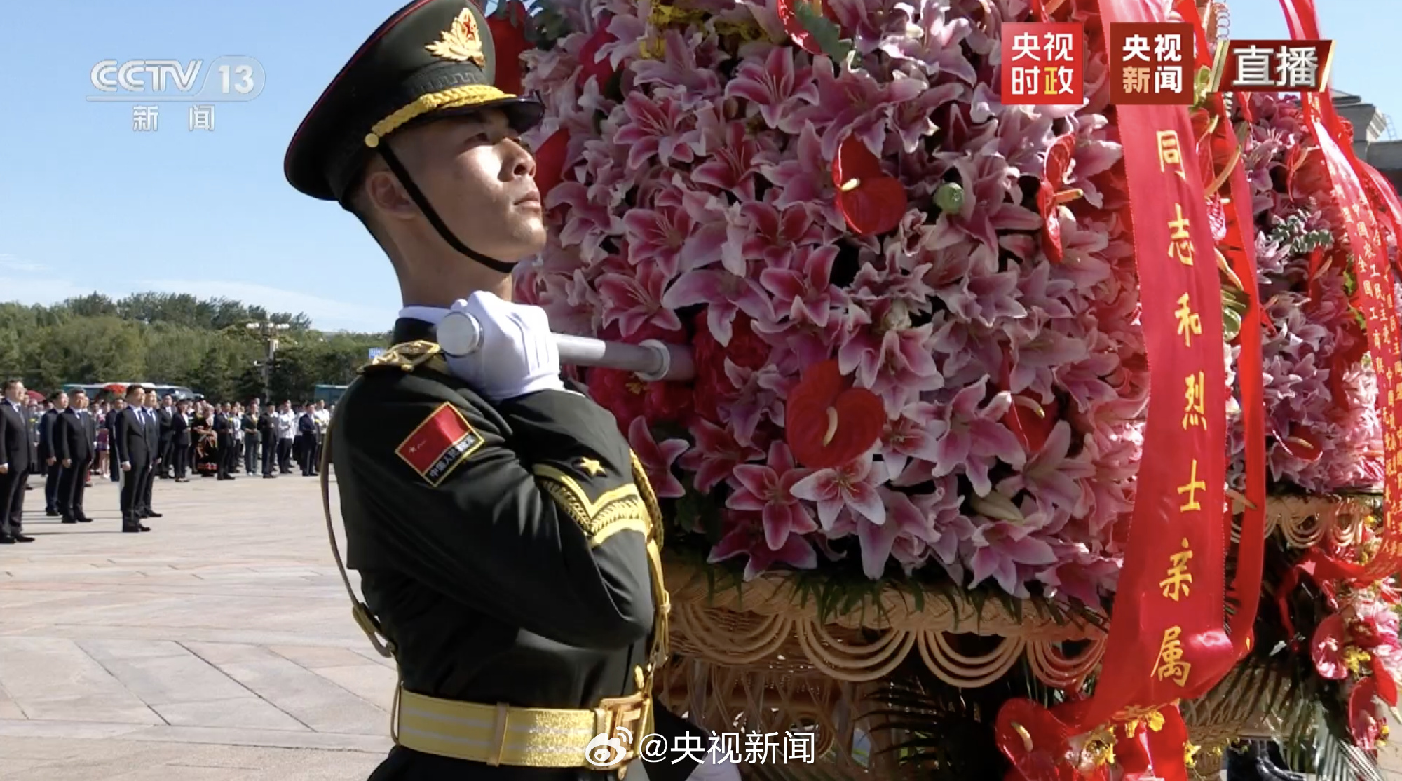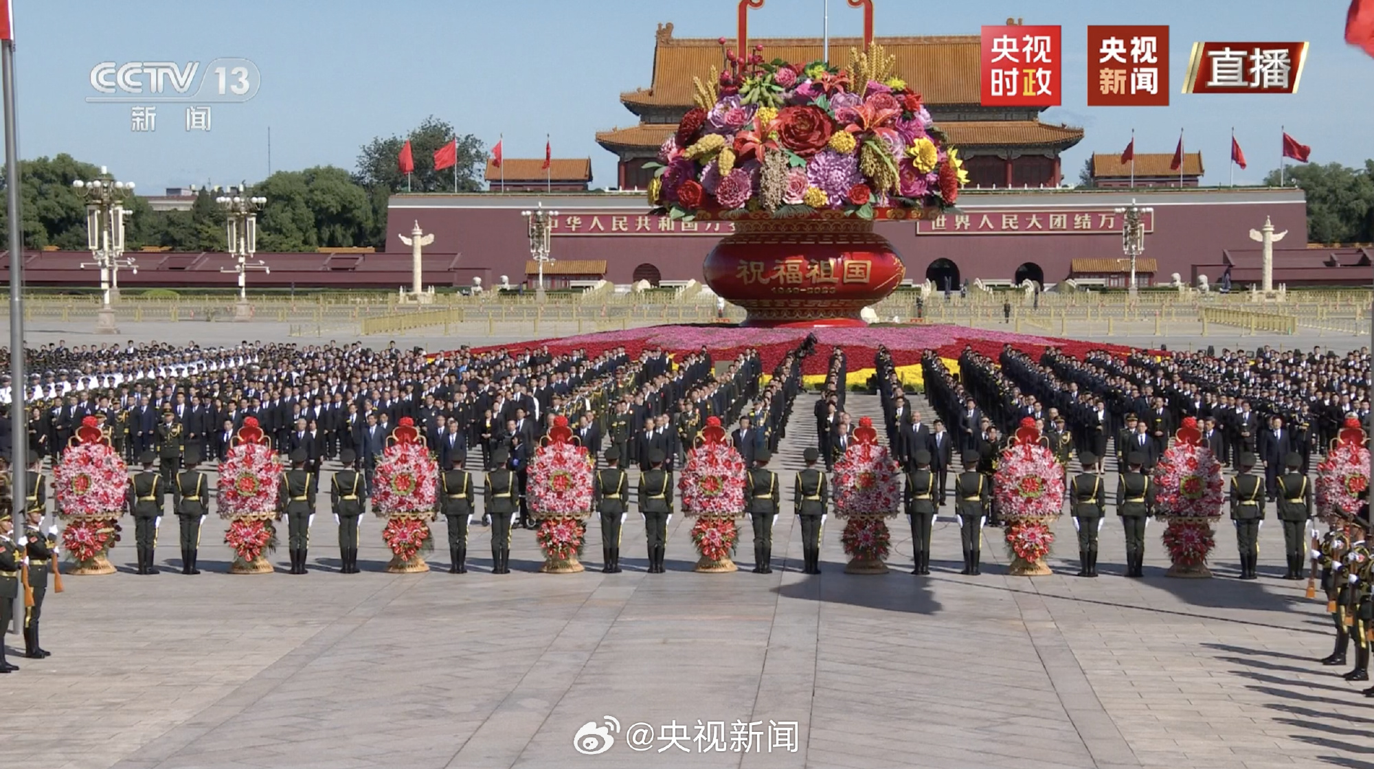 方陣前,以中共中央,全國人大常委會,國務院,全國政協,中央軍委,各民主黨派、全國工商聯和無黨派愛國人士,各人民團體和各界羣眾,老戰士、老同志和烈士親屬,中國少年先鋒隊名義敬獻的9個大型花籃一字排開,花籃紅色緞帶上書寫的“人民英雄永垂不朽”格外醒目。