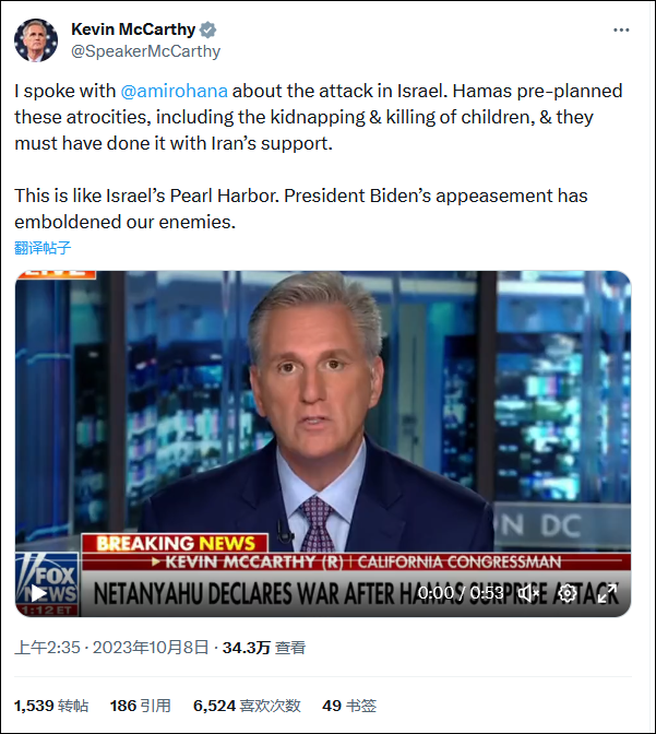 康裏庫斯並非唯一一個提到這一比喻的以色列人。據美國福克斯新聞報道,美國前眾議長麥卡錫7日談到對巴以局勢的評估時透露,他在襲擊發生後同以色列議會議長奧哈納進行了交談,“他們告訴我,這是他們的‘珍珠港(時刻)’”。