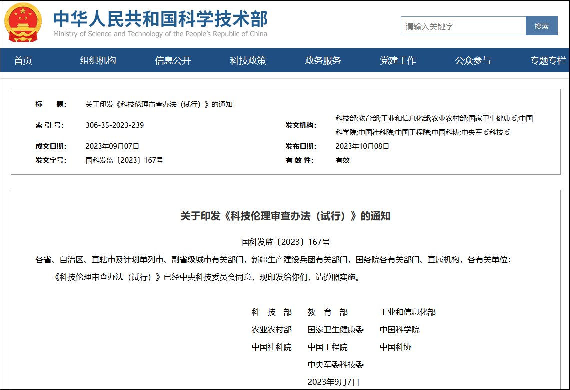 據科技部網站消息,10月8日,科技部會同教育部、工業和信息化部等10部門印發了《科技倫理審查辦法(試行)》。