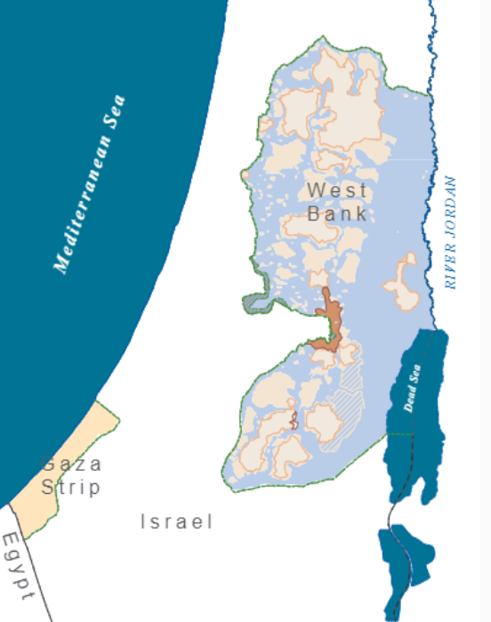 淡黃為巴勒斯坦控制領土,淡橙框內為分散的“A區”(圖源:聯合國)