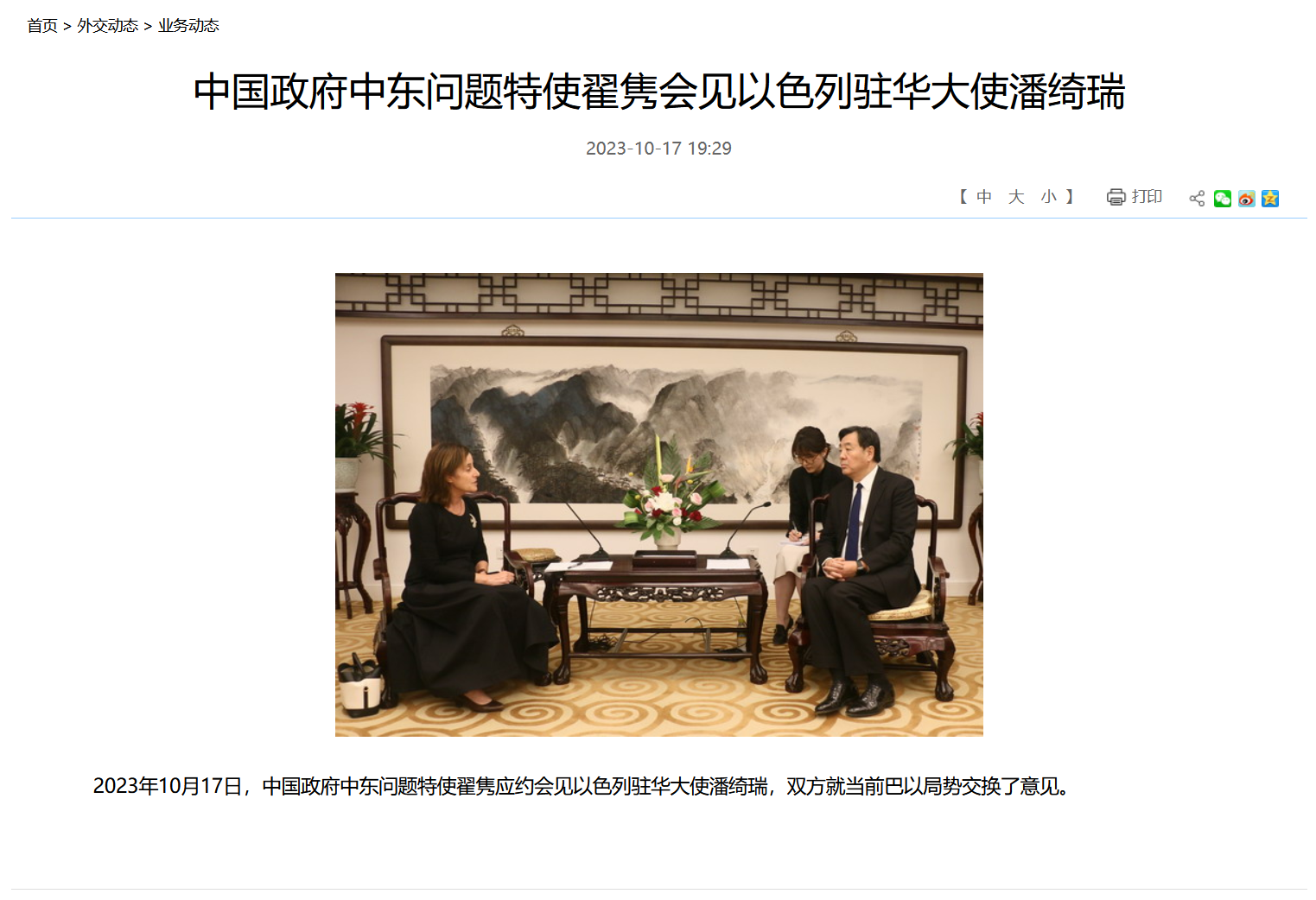 中國政府中東問題特使翟雋會見以色列駐華大使潘綺瑞 None 2023-10-17 外交部網站消息,2023年10月17日,中國政府中東問題特使翟雋應約會見以色列駐華大使潘綺瑞,雙方就當前巴以局勢交換了意見。