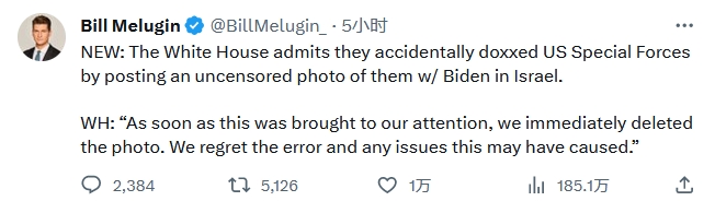 自稱“情報分析員”的薩姆·休梅特(Sam Shoemate)表示,白宮媒體團隊在發佈照片時沒有模糊處理或審查這些三角洲特種部隊成員的臉,發佈一個小時後白宮刪除了照片,但那時已經有成千上萬的人看過了這張照片,他稱白宮這一失職行為是“拜登政府的重大失敗”。