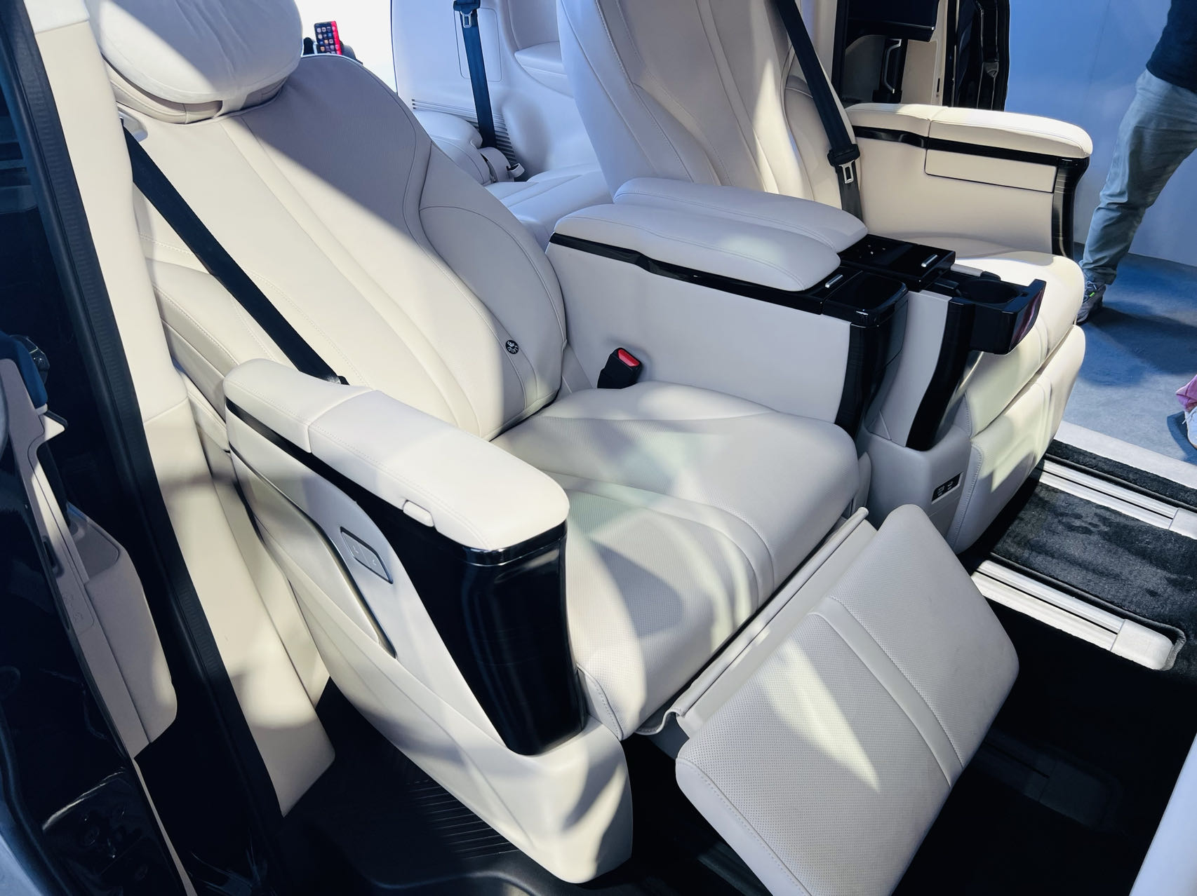 據介紹,該車型整車尺寸相較家用版車型進一步提升,達到5405/1960/1890mm,軸距為3275mm。整車加長後,車內縱向空間達到3823mm,在六座佈局的加持下,車內全部座椅均支持電動調節,並配備加熱、通風功能,可選裝的全尺寸航空座椅具備12向調節、一鍵躺平、10點按摩共6種按摩模式以及無線充電等功能;Harman/kardon音響系統則增加4只頂棚揚聲器,升級為20揚聲器。
