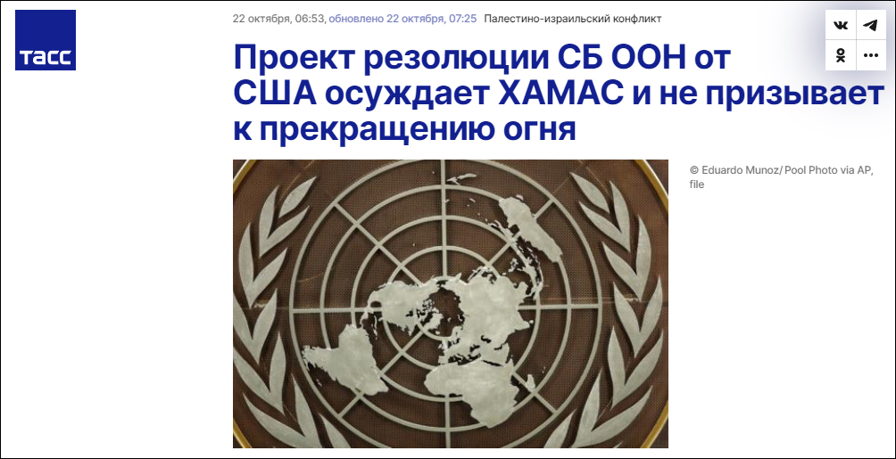 此前,由於英國、美國、法國和日本四個國家反對,聯合國安理會沒有通過俄羅斯關於巴以衝突的決議草案。