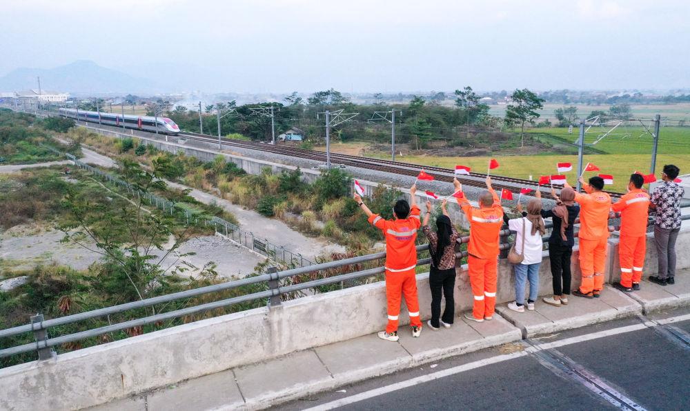 △2023年10月17日,在印度尼西亞萬隆一座天橋上,雅萬高鐵中國建設者和印尼籍員工揮舞着中國和印尼兩國國旗,向遠處駛來的一列雅萬高鐵高速動車組列車歡呼。