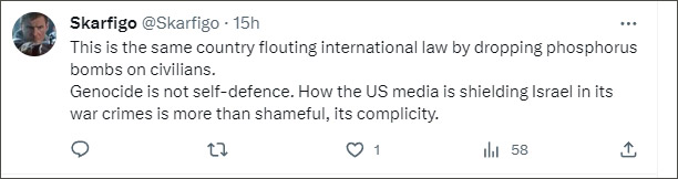 還有人用犀利的言辭寫道:“(以色列)是一個藐視國際法、向平民投擲磷彈的國家。種族滅絕不是自衞。美國媒體是如何包庇以色列的戰爭罪行的,這不僅是可恥的,而且是同謀。”