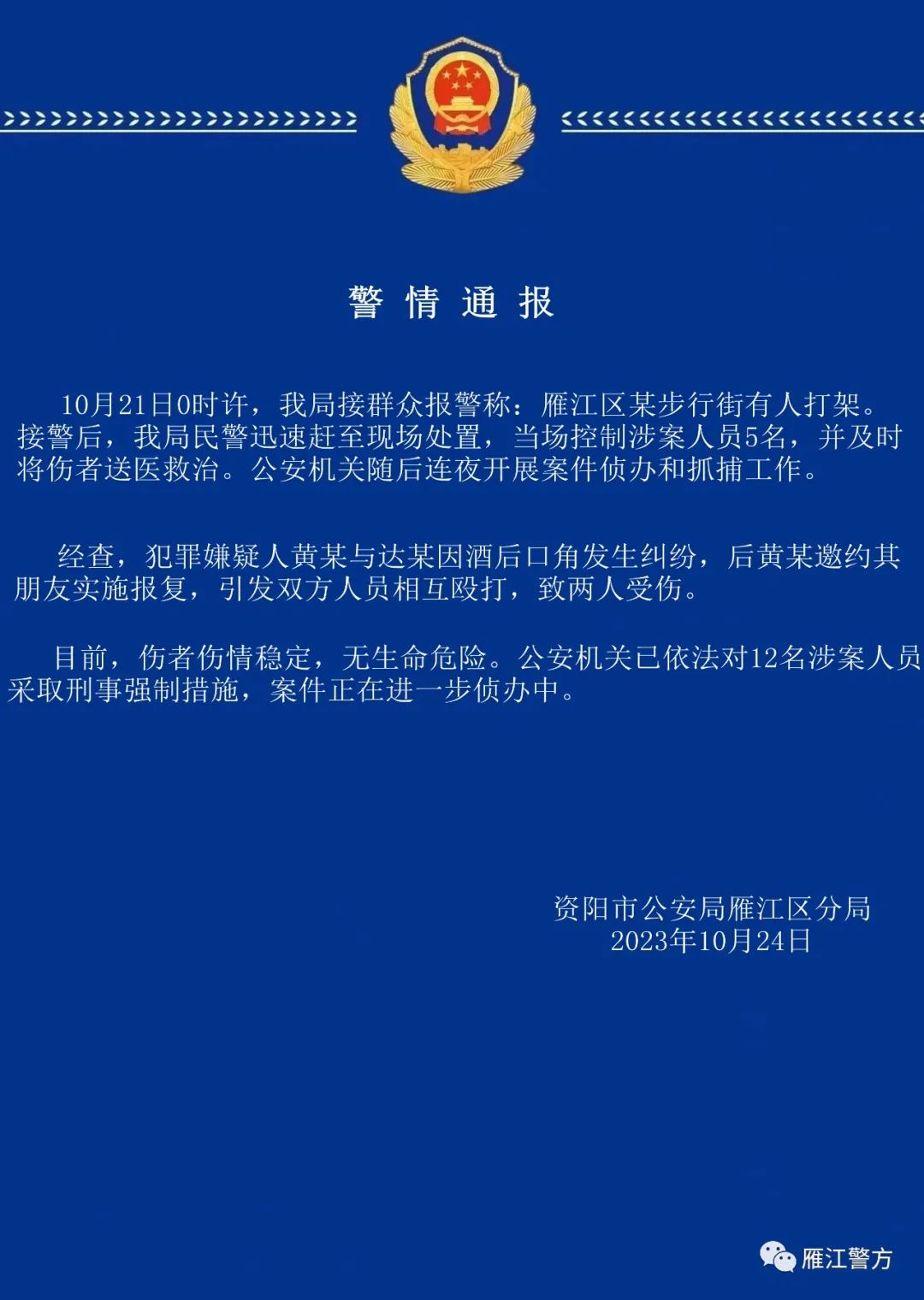 四川資陽市公安局雁江區分局微信公眾號“雁江警方”10月24日發佈警情通報稱,21日0時許,接羣眾報警稱:雁江區某步行街有人打架。接警後,民警迅速趕至現場處置,當場控制涉案人員5名,並及時將傷者送醫救治。公安機關隨後連夜開展案件偵辦和抓捕工作。