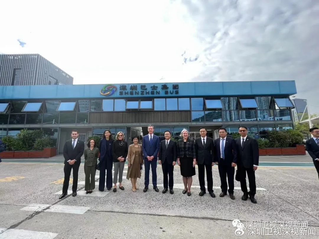 紐森一行來到深圳巴士集團安託山場站參觀,瞭解深圳公交電動化發展情況,並現場試乘了比亞迪電動汽車。