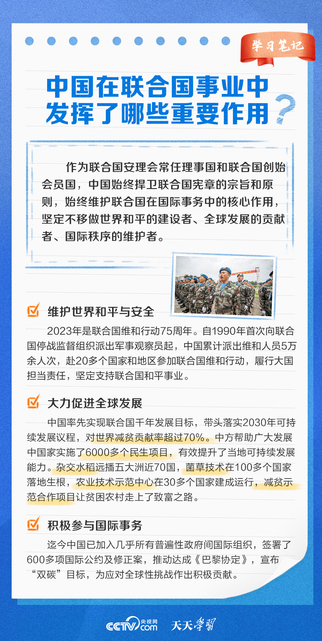 在聯合國成立78週年之際,央視網《天天學習》欄目特梳理聯合國相關知識點及我國在聯合國事業中發揮的重要作用,與您一起學習。