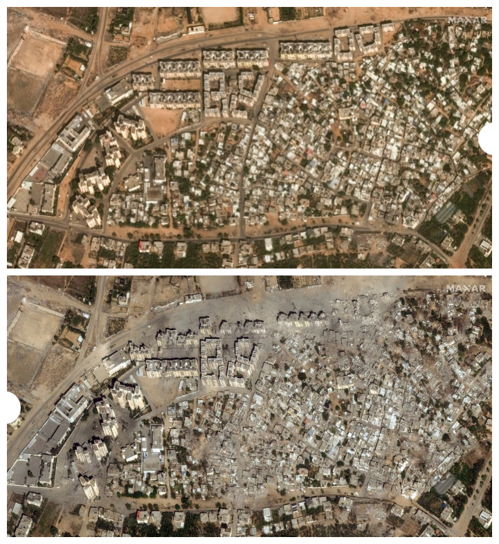 10月21日,加沙地帶北部拜特哈農(Beit Hanoon)的Izbat,本輪衝突前後對比圖(圖源:美聯社)