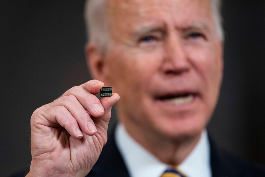拜登展示一塊半導體。他承諾會簽署CHIPS法案。 (圖源:紐約時報)