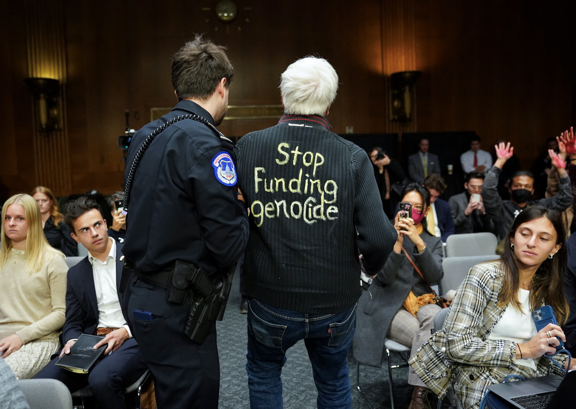 在布林肯發表證詞時,多名反戰抗議者屢次打斷其證詞。