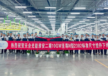 10月中旬,天合光能淮安基地二期10GW至尊N型2382標準尺寸組件和10GW N型i-TOPCon電池成功下線,先進的N型電池、組件產能加速落地,以滿足N型時代高功率及超高功率組件日益增長的需求。