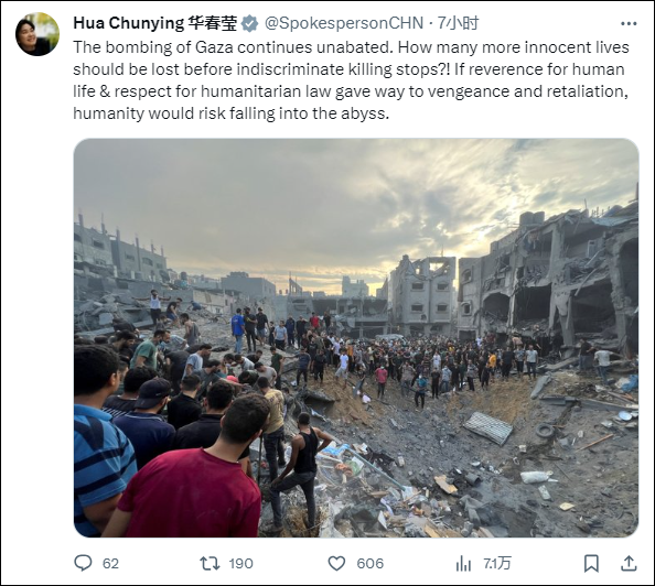 11月1日,華春瑩再度用英語和阿拉伯語發文説:“針對加沙的轟炸仍在繼續。還要多少無辜生命逝去才能停止濫殺無辜?!如果將復仇和報復凌駕於對生命、國際法的最起碼尊重和敬畏之上,人類恐將墜入深淵。”