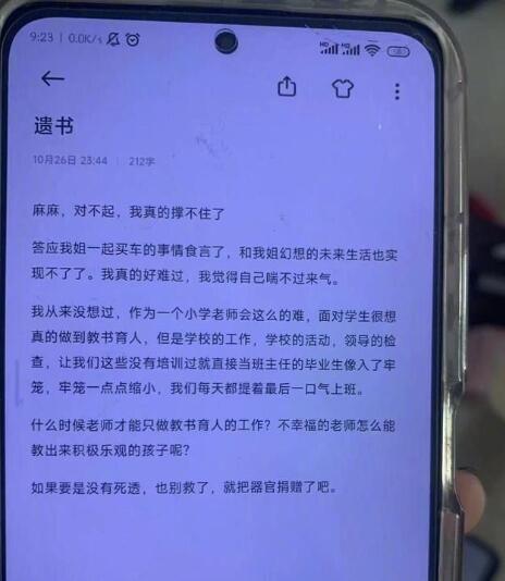 另據此前報道,10月31日,河南鄭州管城區建興路小學一女教師呂某留遺書後跳樓自殺的帖子引起網絡關注。女老師在遺書中稱,面對學生很想教書育人,但學校的工作、活動、領導的檢查,讓她像進了“牢籠”,“每天提着最後一口氣在工作”。家屬告訴新黃河記者,事發後,校方領導拒不認責,甚至拒絕家屬進入校園,查看監控。