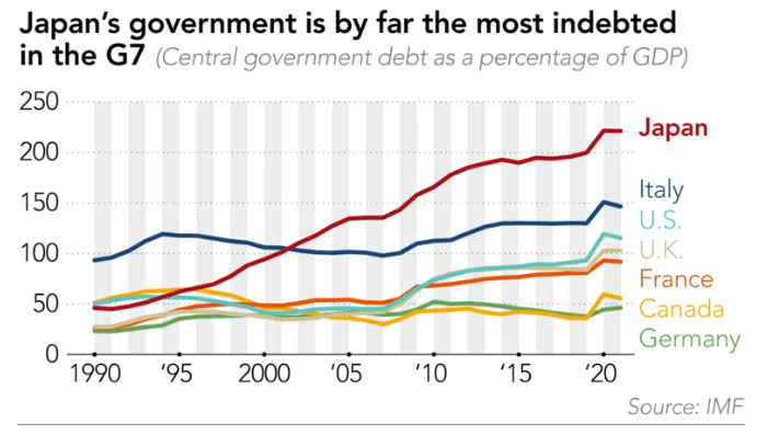 日本政府是世界上國家負債率最高的政府,根據國際貨幣基金組織的數據,2021年10月,日本國債對GDP之比即國家負債率高達262%。在這裏,我們以日本來説明上述觀點為什麼是錯誤的。