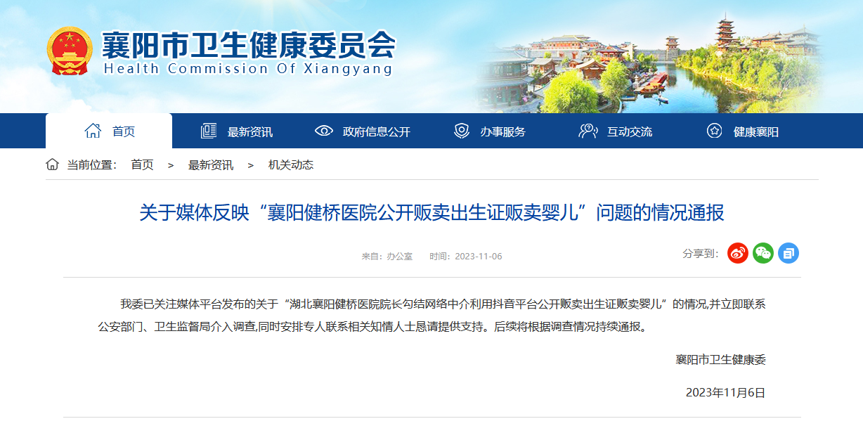 據襄陽市衞生健康委員會網站消息,湖北襄陽市衞生健康委11月6日發佈關於媒體反映“襄陽健橋醫院公開販賣出生證販賣嬰兒”問題的情況通報: