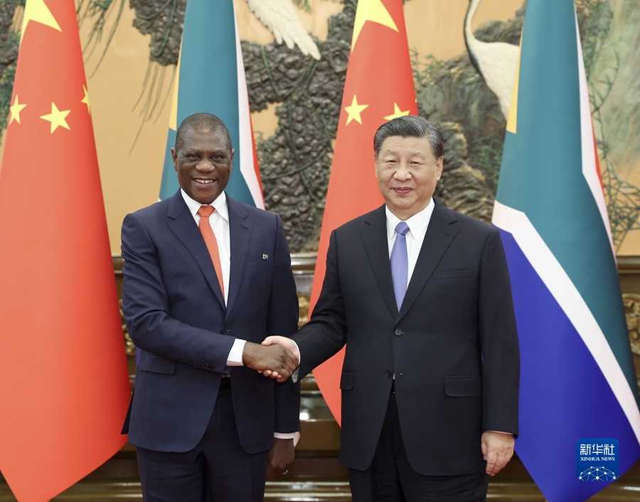 習近平指出,今年是中南建交25週年,兩國關係步入“黃金時代”。今年8月,我對南非進行了第四次國事訪問,同拉馬福薩總統一致決定,中南兩國要做高度互信的戰略伙伴、共同進步的發展夥伴、相知相親的友好夥伴、維護正義的全球夥伴。中方願同南非一道,不斷充實中南全面戰略伙伴關係內涵,推動兩國關係再上新台階。