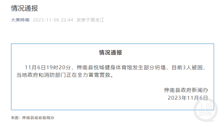 6日晚22時44分,樺南縣政府新聞辦發佈情況通報稱,11月6日19時20分,樺南縣悦城健身體育館發生部分坍塌,目前3人被困,當地政府和消防部門正在全力冒雪營救。