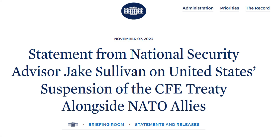 當地時間7日,美國總統國家安全事務助理沙利文在白宮網站發佈聲明説,經與北約盟國密切協商和協調後,美國決定從12月7日起暫停履行《歐洲常規武裝力量條約》下的所有義務,以回應俄羅斯的行動。