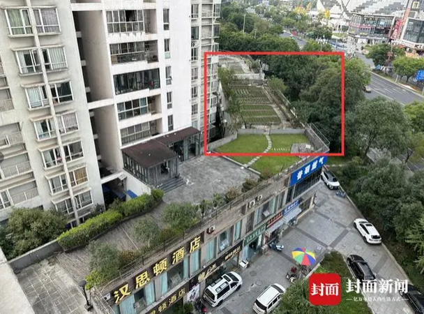 目前,該花園被鐵柵欄圍住,成為隔壁樓棟業主獨自使用。站在高樓層看去,可以發現花園已被分為多塊區域,種有植物,一片綠地以及一片菜地,一户業主通過搭建的玻璃房進入。