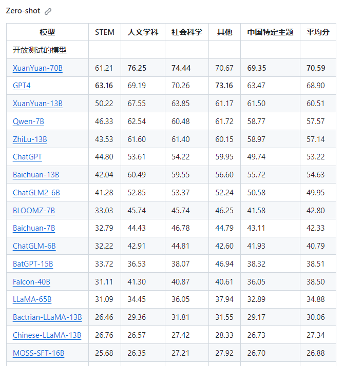 同為zero-shot測試,“XuanYuan-70B”模型則在“開放測試組”中獲得了均分第一名。