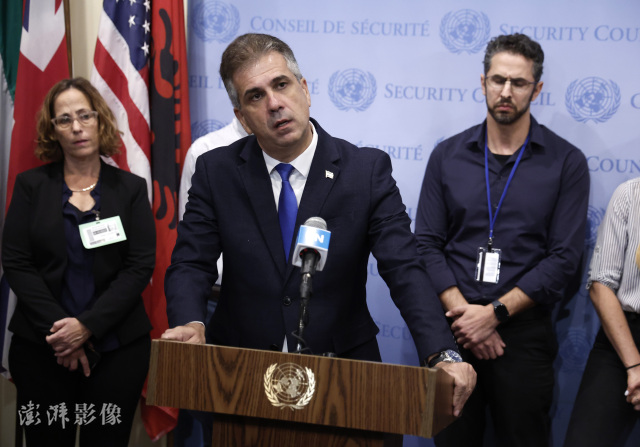 10月24日,聯合國安理會舉行巴以問題公開辯論會後,以色列常駐聯合國代表埃爾丹出席新聞發佈會。圖自澎湃影像