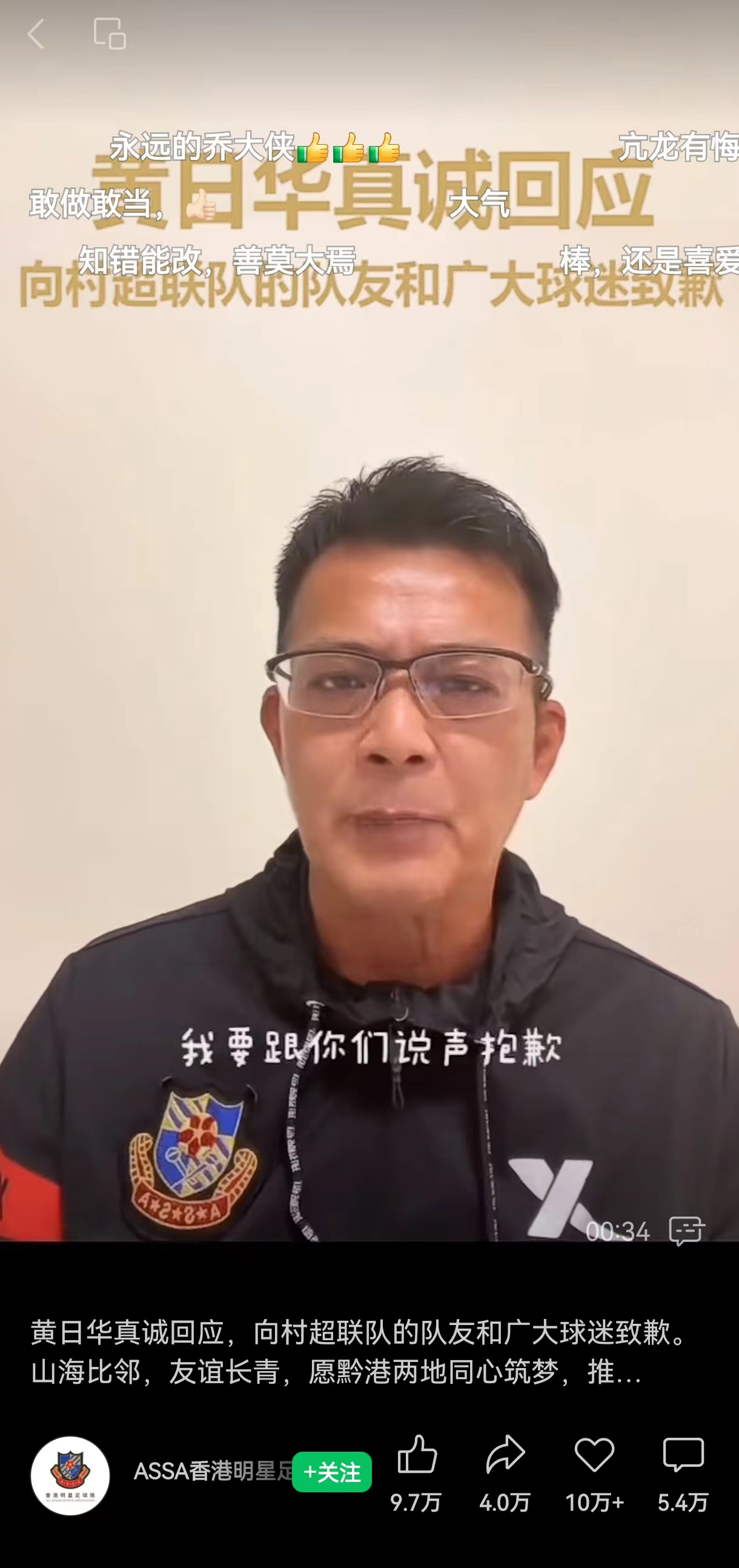 黃日華説:“這幾天我看過好多視頻,也看過所有網友對我的批評,我都全部一一接受。因為經過自我反省之後,我覺得我在控制情緒方面真的做得不好,還有很多需要改善的空間。在這裏,我覺得我是做錯了。所以,在這裏我要跟所有村超聯隊的球員們、貴州的朋友、全國的球迷、所有的網友,我要跟你們説聲抱歉!對不起,我錯了,對不起。”