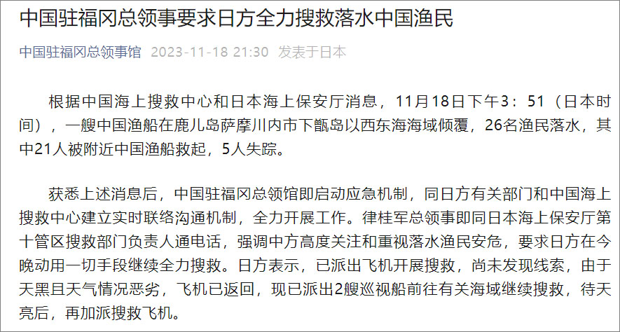 獲悉上述消息後,中國駐福岡總領館即啓動應急機制,同日方有關部門和中國海上搜救中心建立實時聯絡溝通機制,全力開展工作。律桂軍總領事即同日本海上保安廳第十管區搜救部門負責人通電話,強調中方高度關注和重視落水漁民安危,要求日方在今晚動用一切手段繼續全力搜救。