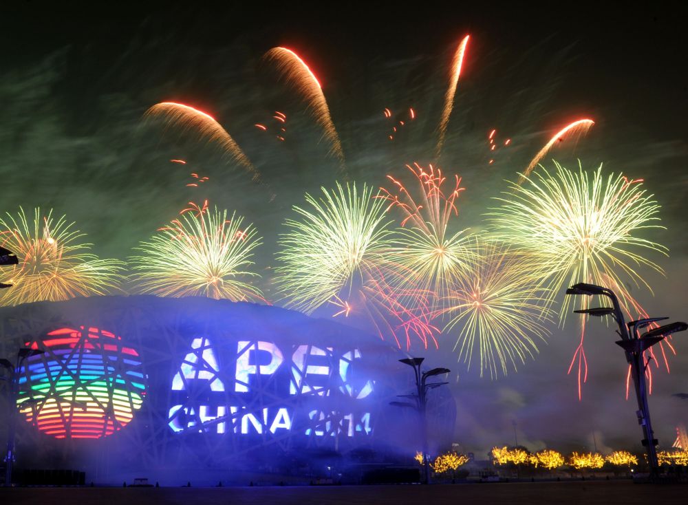 2014年11月10日,亞太經合組織(APEC)第二十二次領導人非正式會議在北京舉行,北京在奧林匹克公園舉行焰火表演。(圖/新華社)