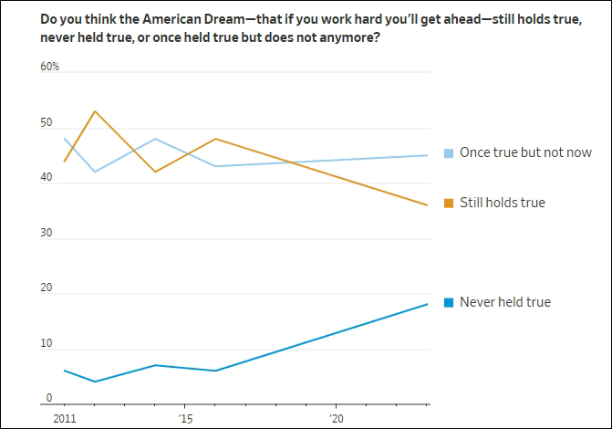 只有36%的選民表示“美國夢”仍然存在,《華爾街日報》製圖(下同)
