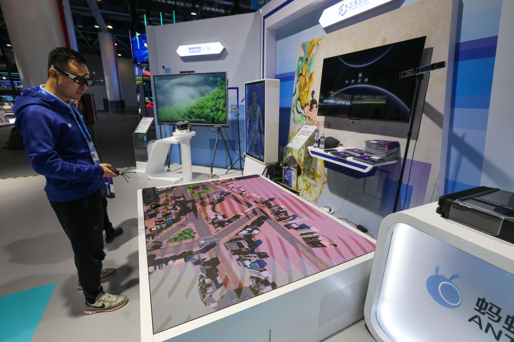 11月23日,在第二屆全球數字貿易博覽會上,參觀者戴上VR眼鏡漫遊虛擬城市。新華社記者 徐昱 攝