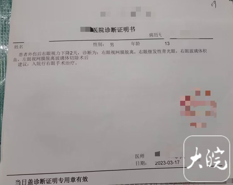 11月28日,胡女士向大皖新聞記者提供了幾份醫院診斷證明書。其中2023年3月17日的診斷證明書上寫着:患者外傷後右眼視力下降2天,診斷為右眼視網膜脱落,右眼繼發性青光眼,右眼玻璃體積血,左眼視網膜脱離玻璃體切除術後。