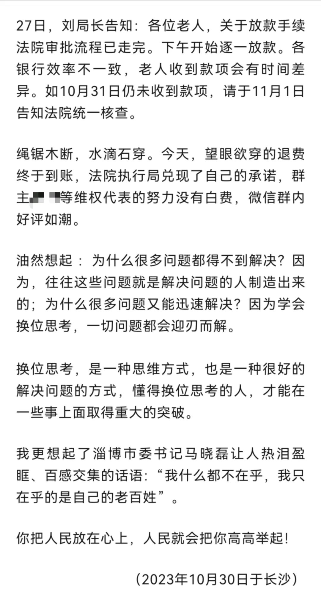 還有老人在自己的社交媒體上這樣寫: “法院執行局兑現了自己的承諾,微信羣內好評如潮。你把人民放在心上,人民就會把你高高舉起!”