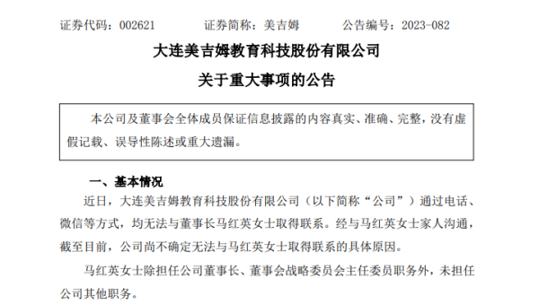 另一位失聯董事長馬紅英為早教第一股美吉姆的董事長。公告表示,馬紅英未持有公司股份。馬紅英除擔任公司董事長、董事會戰略委員會主任委員職務外,未擔任公司其他職務。