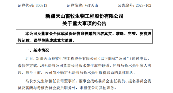 11月29日晚,*ST天山發佈公告,披露公司董事長馬長水失聯的消息。公告表示,公司通過電話、微信等渠道未能聯繫上馬長水,目前尚不明確失聯的具體原因,引起了市場的廣泛關注。