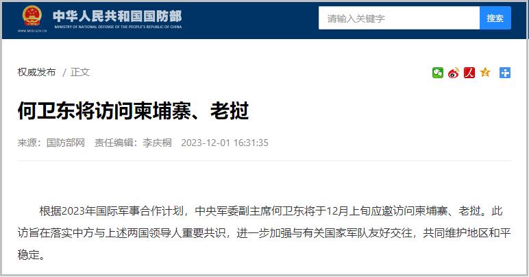 何衞東將訪問柬埔寨、老撾 guancha 2023-12-01 據國防部網站12月1日消息,根據2023年國際軍事合作計劃,中央軍委副主席何衞東將於12月上旬應邀訪問柬埔寨、老撾。此訪旨在落實中方與上述兩國領導人重要共識,進一步加強與有關國家軍隊友好交往,共同維護地區和平穩定。