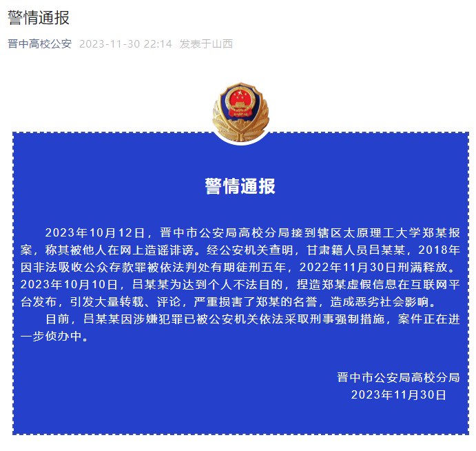 2023年10月12日,晉中市公安局高校分局接到轄區太原理工大學鄭某報案,稱其被他人在網上造謠誹謗。經公安機關查明,甘肅籍人員呂某某,2018年因非法吸收公眾存款罪被依法判處有期徒刑五年,2022年11月30日刑滿釋放。2023年10月10日,呂某某為達到個人不法目的,捏造鄭某虛假信息在互聯網平台發佈,引發大量轉載、評論,嚴重損害了鄭某的名譽,造成惡劣社會影響。
