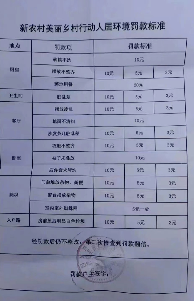 另據九派新聞此前報道,前段時間,四川涼山普格縣新農村村委會發布了《新農村美麗鄉村行動人居環境罰款標準》。