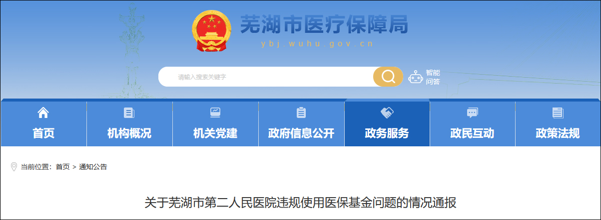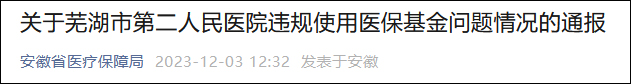 安徽省蕪湖市醫療保障局網站12月3日發佈《關於蕪湖市第二人民醫院違規使用醫保基金問題的情況通報》。