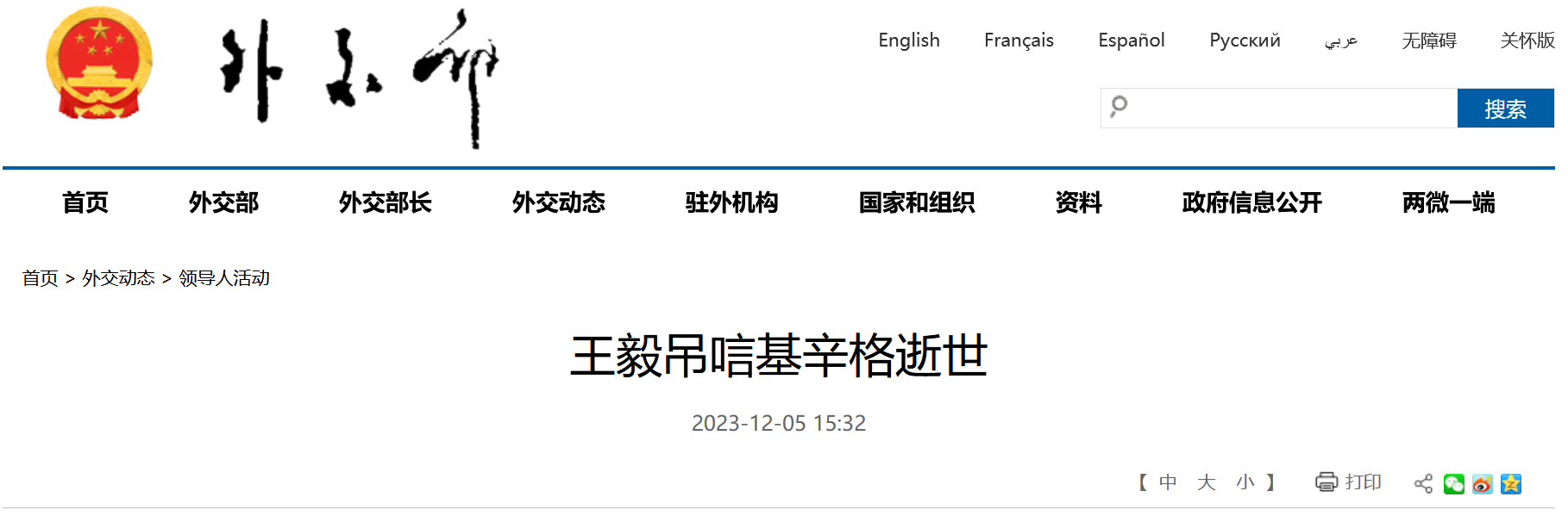 王毅弔唁基辛格逝世
