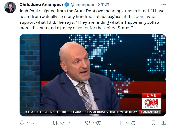 (觀察者網訊)大約兩個月前,負責監督武器轉讓的時任美國國務院關鍵高官喬希·保羅(Josh Paul)宣佈辭職。他當時在公開信中表示,自己“無法承受因軍援以色列產生的道德妥協”,並尖鋭批評美國政府的軍援決定具有“破壞性、短視、不公正”。