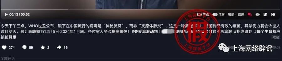 上海闢謠平台在核查中發現,不少自媒體在傳播“世衞組織宣佈‘神秘肺炎’”時,存在斷章取義、以偏概全的做法,包括曲解世衞組織官方聲明、隻字不提國家衞健委發佈的信息等;還有部分自媒體將網傳不實文字與賬號日常視頻相結合,沒有任何根據地聲稱“今天下午3點宣佈”“昨天下午3點宣佈”等。