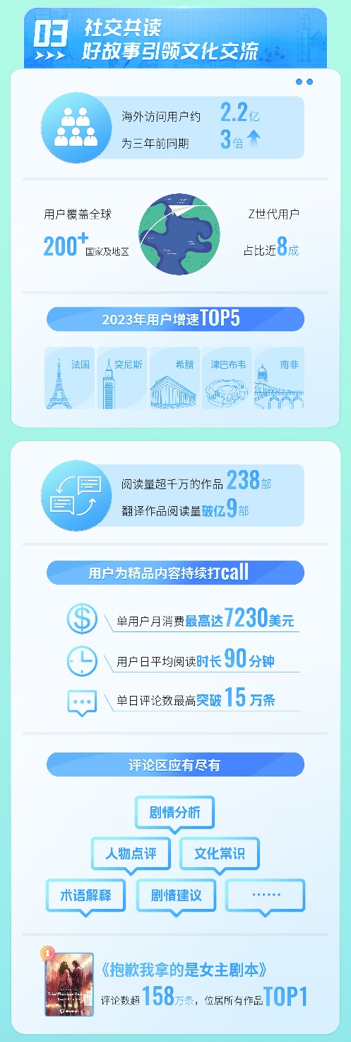 隨着海外網文生態的日益成熟,在線閲讀本身的訴求和年輕世代的網絡社交習慣,讓海外的讀者們更願意表達,也讓圍繞內容但又不限於內容的社交變得越來越頻繁。截至2023年10月,起點國際的訪問用户數突破2.2億,為三年前同期3倍。這些用户來自全球200多個國家及地區,可謂“凡通網絡處,皆有網文讀者”。