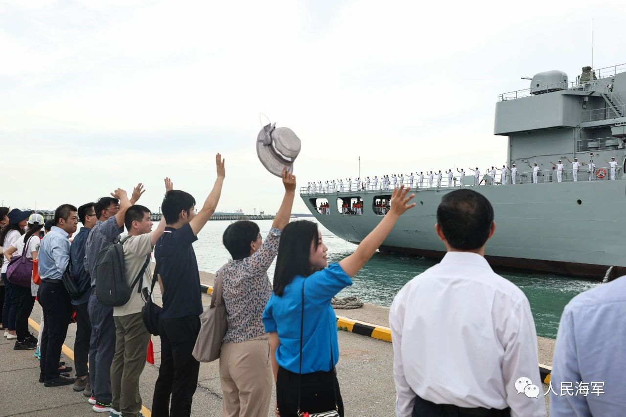 中國駐新加坡大使館朱憬代辦和使館工作人員、當地華人華僑代表以及新海軍官兵代表在碼頭迎接。